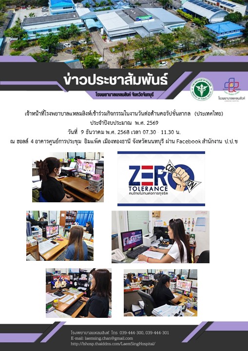 เมื่อวันอังคารที่ ๙ ธันวาคม พ.ศ. ๒๕๖๘ เวลา ๐๗.๓๐ – ๑๑.๓๐ น. เจ้าหน้าที่โรงพยาบาลแหลมสิงห์ เข้าร่วมกิจกรรมวันต่อต้านคอรัปชั่นสากล (ประเทศไทย) ณ ฮอลส์ ๔ อาคารศูนย์การประชุม อิมแพ็ค เมืองทองธานี จังหวัดนนทบุรี โดยมีช่องทางรับชมผ่าน Facebook สำนักงาน ป.ป.ช.